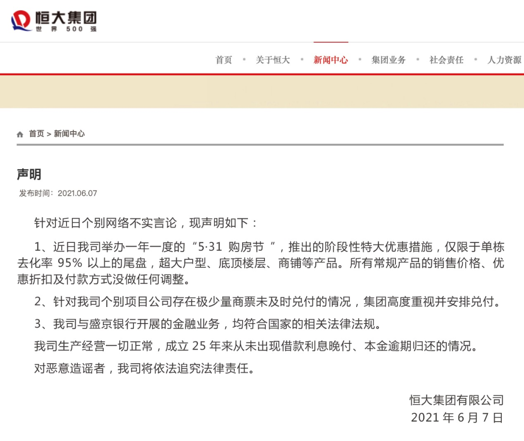 然而,在恒大“大象起舞”的過程中,也出現了一些質疑。6月7日,恒大發(fā)布聲明,稱公司生產經營一切正常,對惡意造謠者,將依法追究法律責任。