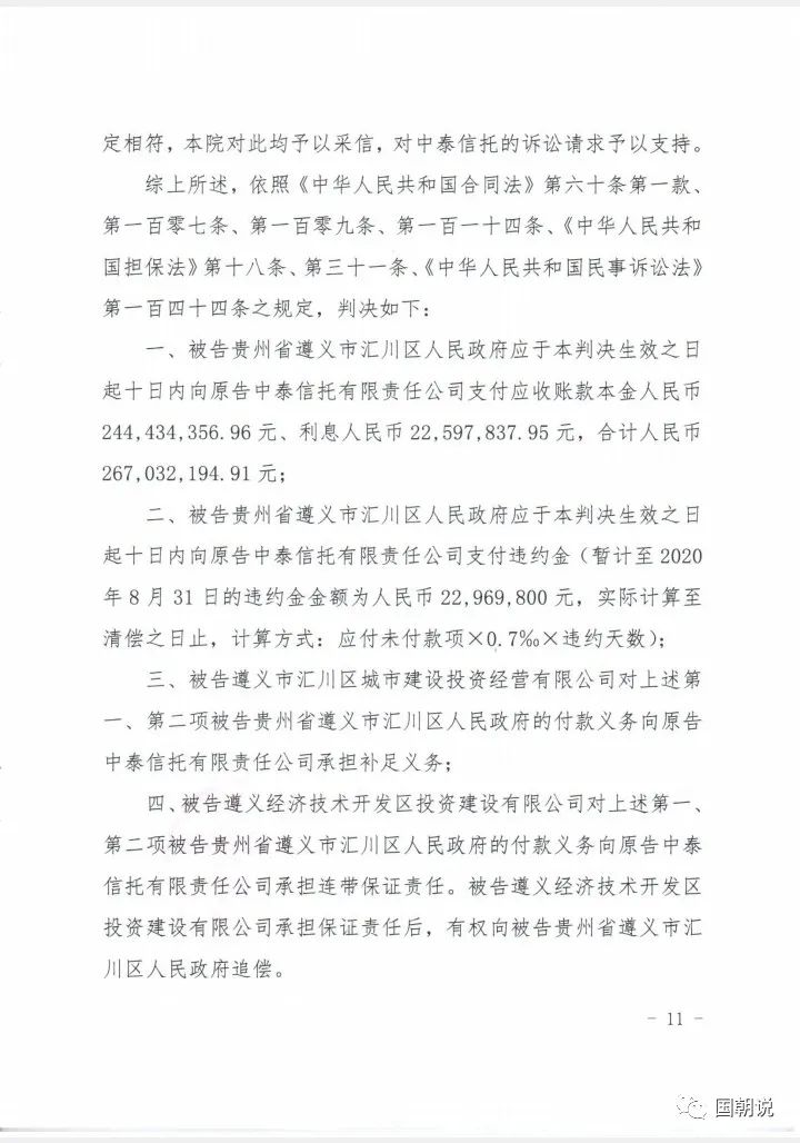 2020年12月30日,上海金融法院公布了一審判決結(jié)果,被告貴州省遵義市匯川區(qū)人民政府應(yīng)于本判決生效之日起十日內(nèi)向原告中泰信托支付應(yīng)收賬款本金2.44億元,利息0.23億元,合計2.67億元。