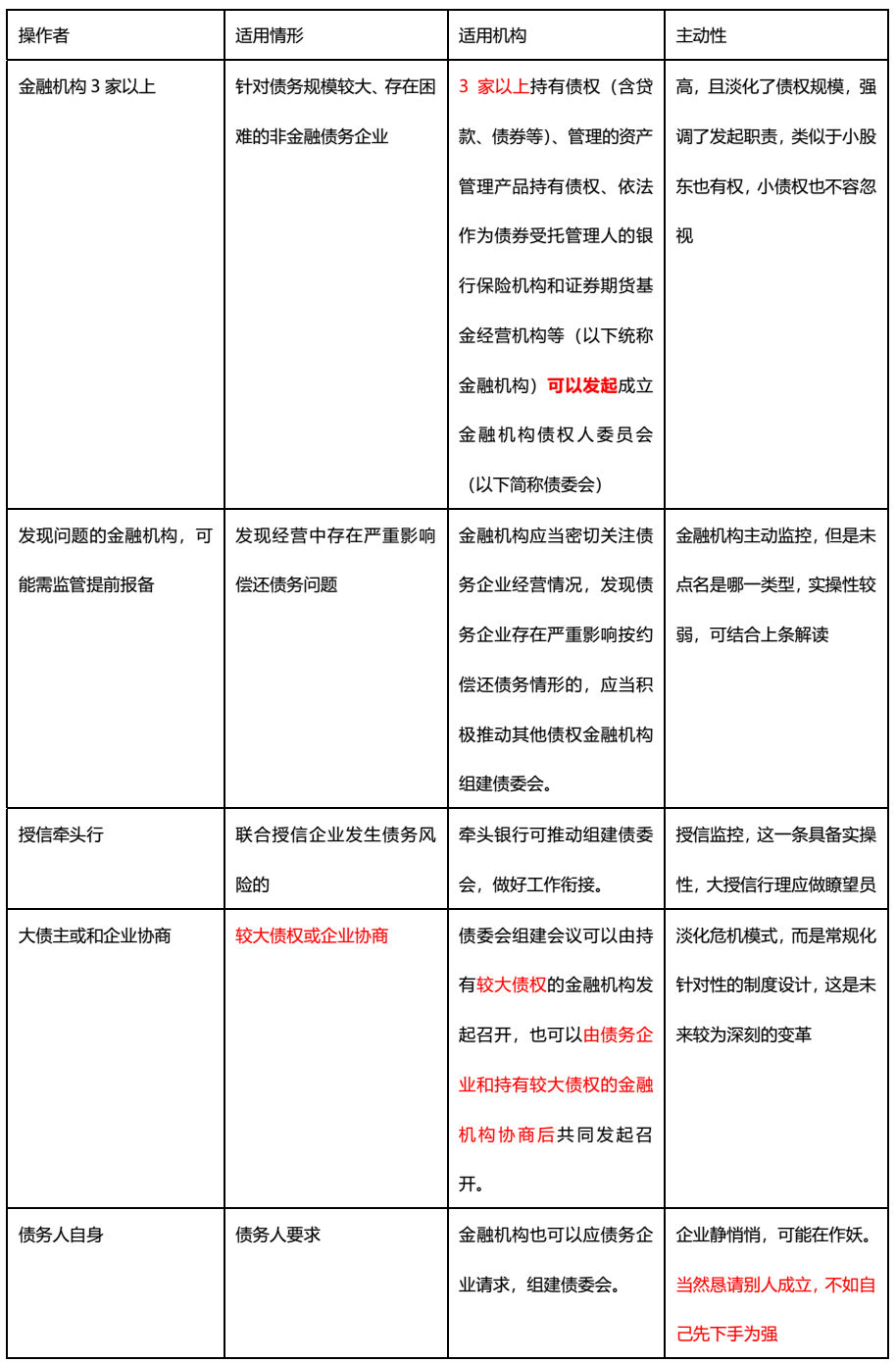 一句應(yīng)當(dāng),應(yīng)當(dāng),是風(fēng)險(xiǎn)防范的意識(shí)要求,也是監(jiān)管對(duì)于粗放式金融管理的精細(xì)化進(jìn)階要求,因而后續(xù)可能債委會(huì)更為時(shí)髦,不一定是此前的已經(jīng)到難以為繼的狀態(tài)才設(shè)立。