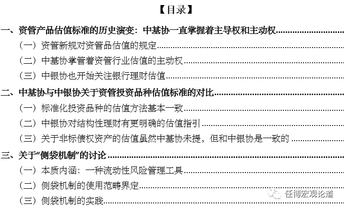 2、資管新規與理財新規發布后, 中銀協也開始深入到銀行理財估值標準的實踐中,分別于2019年8月5日發布了《商業銀行理財產品核算估值指引(征求意見稿)》、2020年9月8日成立了“理財會計與估值”工作組、2020年8月20日發布了《理財產品會計核算指引(試行)》(征求意見稿),這意味著證監和銀保監兩大體系,在估值的問題上既在爭取主動權,亦趨于統一。