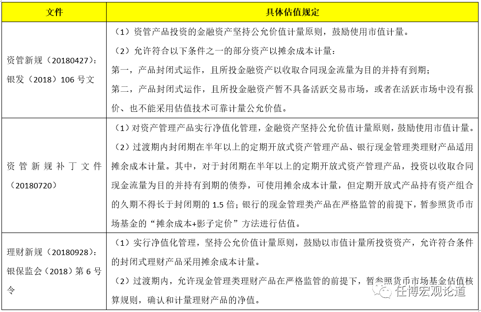 整體來看,一系列政策文件在過渡期內允許符合一定的封閉式產品以及現金管理產品采取攤余成本法之外,均鼓勵對資管產品以公允價值(含市價)方法進行估值。這里面可能需要給予關注的是現金管理類產品和封閉期在半年以上的定開產品。不過需要說明的是,即便是采用攤余成本法計量的貨幣基金,目前政策部門也在進行市值法試點。