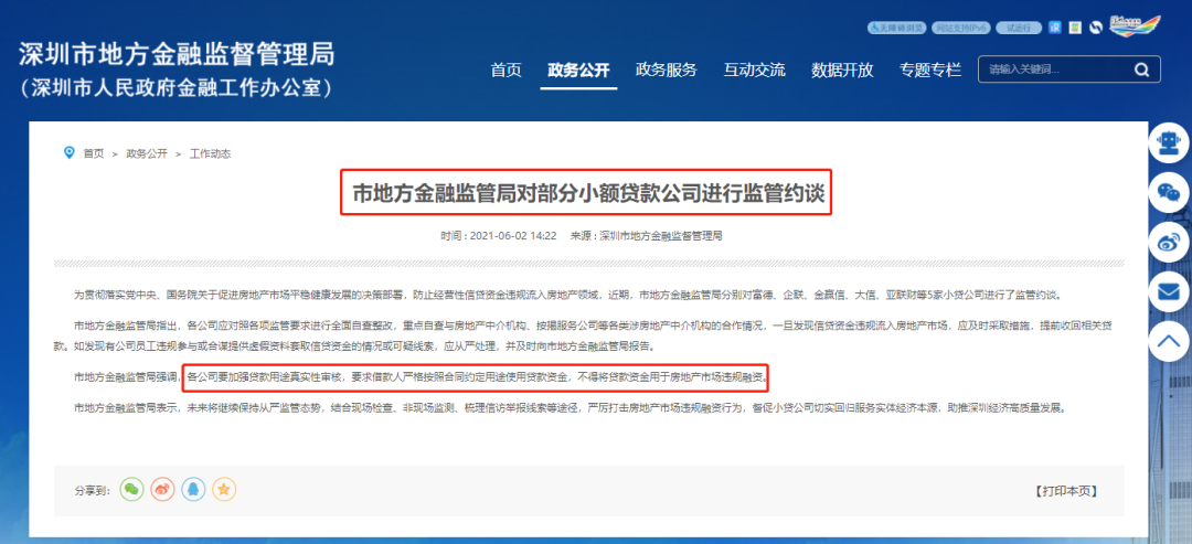 緊接著,深圳、廣州兩地監管部門就發文,要求小貸公司自查,嚴禁信貸資金違規流入樓市,一旦發現及時采取相關措施,收回貸款。