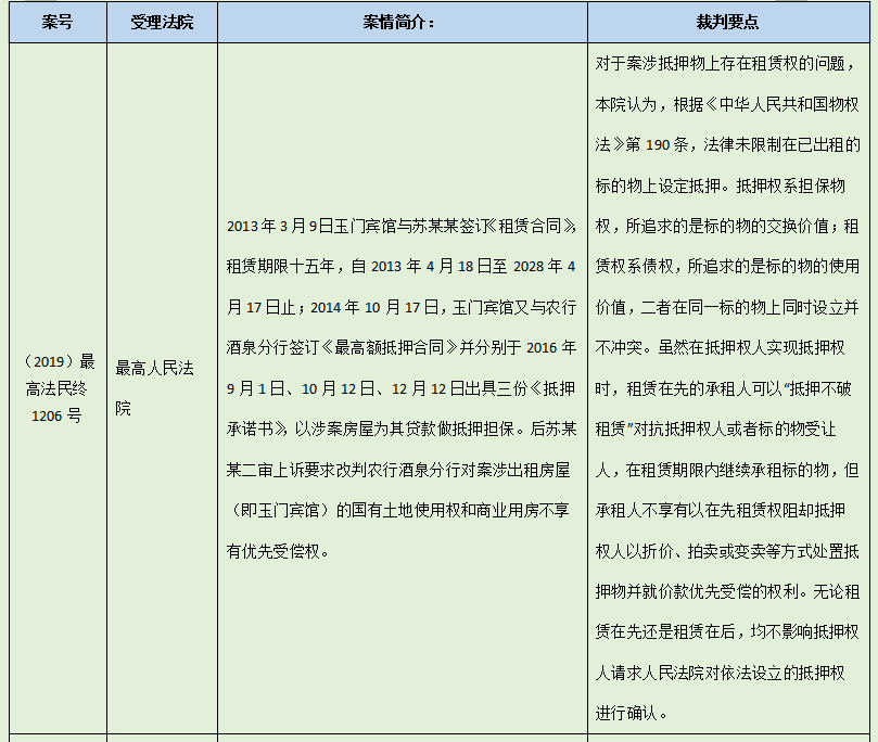 雖然《物權(quán)法》的規(guī)定存在一些模糊的地方,但部分法院在實(shí)操案例中,對(duì)如何認(rèn)定“抵押權(quán)與租賃權(quán)”的順位關(guān)系,也作出了自己的裁判觀點(diǎn),《民法典》的修改可以說一定程度上對(duì)此進(jìn)行了吸收。本文對(duì)前述部分裁判觀點(diǎn)進(jìn)行了總結(jié),希望對(duì)讀者有所啟發(fā)。