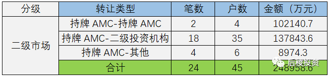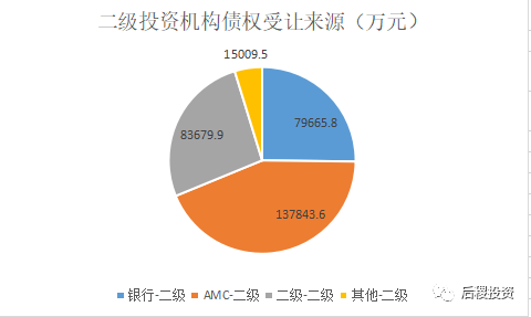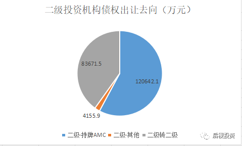 三級市場共出讓22億余元,二級投資機構類總出讓金額占三級市場92%左右,其他類占三級市場約8%。成交規模最大的為二級投資機構-持牌AMC,成交金額在三級市場中占比53.5%。相較18年,三級市場轉讓金額增加約12億元,其中二級-持牌AMC轉讓金額增加約6億元,二級-二級轉讓金額增加約6億元。