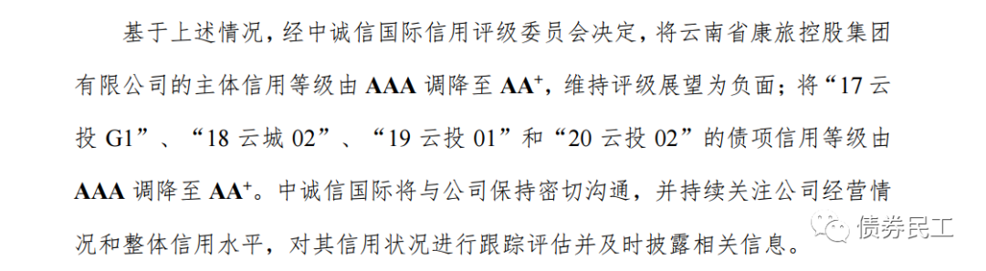 根據中誠信國際2022年2月7日披露的公告,云南省康旅控股集團有限公司的主體信用等級由AAA調降至AA+,評級展望保持為負面。