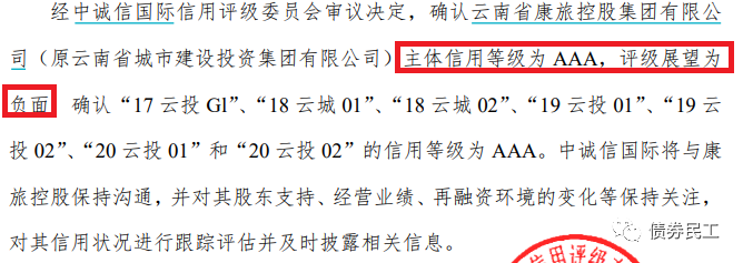 根據中誠信國際2022年2月7日披露的公告(蓋章日為2022年1月27日),云南省康旅控股集團有限公司(原名為云南省城市建設投資集團有限公司,以下簡稱“云南康旅集團”)的主體信用等級由AAA調降至AA+,評級展望保持為負面。這是2022年以來首個AAA發行人主體評級被下調!