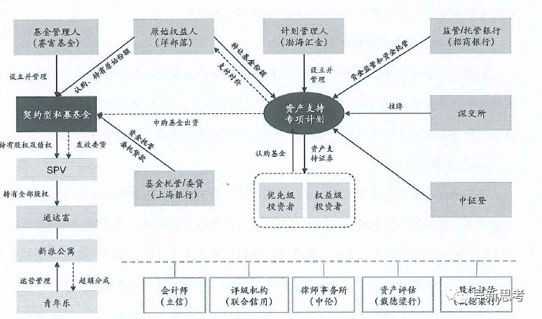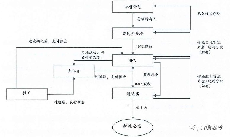 在搭建該類REITS結(jié)構(gòu)前的既有結(jié)構(gòu)中,青年樂(lè)為新派公寓的整租方和運(yùn)營(yíng)方,即青年樂(lè)與通達(dá)富簽署《整租協(xié)議》,并定期向通達(dá)富支付租金,青年樂(lè)再將新派公寓轉(zhuǎn)租給租客,賺取租金差價(jià);在該交易結(jié)構(gòu)中,由SPV、通達(dá)富、青年樂(lè)簽署三方《委托管理協(xié)議》,期限5年,約定SPV承接青年樂(lè)的職能,從通達(dá)富整租新派CBD物業(yè)并對(duì)外分租,原青年樂(lè)和通達(dá)富的總租關(guān)系終止。SPV委派青年樂(lè)提供租賃運(yùn)營(yíng)管理服務(wù),包括但不限于確定金水平、催收、日常管理物業(yè)改造等安排,青年樂(lè)業(yè)績(jī)激勵(lì)費(fèi)占當(dāng)年SPV的分租租金和綜合配套收入之和的【5】%,且青年樂(lè)承諾從2018年起,SPV每年可分配凈現(xiàn)金流不低于【800】萬(wàn)/年(扣除青年樂(lè)的業(yè)績(jī)激勵(lì)費(fèi)之后);若SPV的可分配凈現(xiàn)金流不足上述標(biāo)準(zhǔn)的,青年樂(lè)承諾無(wú)條件不可撤銷地予以差額補(bǔ)足。