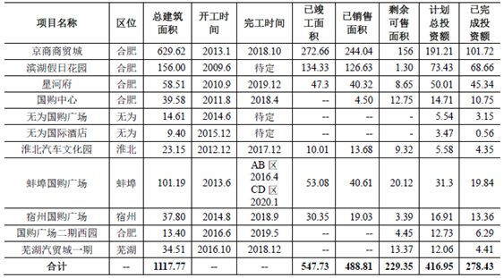 除去司爾特的4.45億存貨外,公司存貨約有121億,主要是開發(fā)成本和開發(fā)產(chǎn)品,但其實(shí)很難從公司的年報和評級報告中把存貨細(xì)項(xiàng)直接核對出來。從在建地產(chǎn)項(xiàng)目來看,投入金額總和為278億,遠(yuǎn)大于121億的存貨金額,說明公司公布的在建項(xiàng)目里面有部分其實(shí)已經(jīng)結(jié)轉(zhuǎn)了;金額最大的幾個項(xiàng)目是合肥京商商貿(mào)城、濱湖假日花園、星河府和合肥國購中心;然而在17年9月底時,公司經(jīng)營性物業(yè)面積最大的就是合肥京商商貿(mào)城和合肥國購中心,而且這兩項(xiàng)目都還處于招商中,說明公司的業(yè)績嚴(yán)重依賴于兩三個在開發(fā)以及已建成但還未運(yùn)營的項(xiàng)目-合肥京商商貿(mào)城、合肥國購中心和星河府。這三個項(xiàng)目中,除了星河府有部分住宅外,其它基本都是商辦和公寓酒店這類去化非常慢的項(xiàng)目,所以有地產(chǎn)開發(fā)界人士曾告訴筆者國購是死于商業(yè)地產(chǎn)也不無道理。