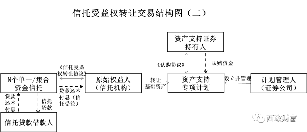 1.資金信托委托人以信托項下資金向借款人發(fā)起多筆債權(quán)資產(chǎn),信托機構(gòu)按照ABS入池標(biāo)準(zhǔn)篩選特定的符合要求的資金信托;