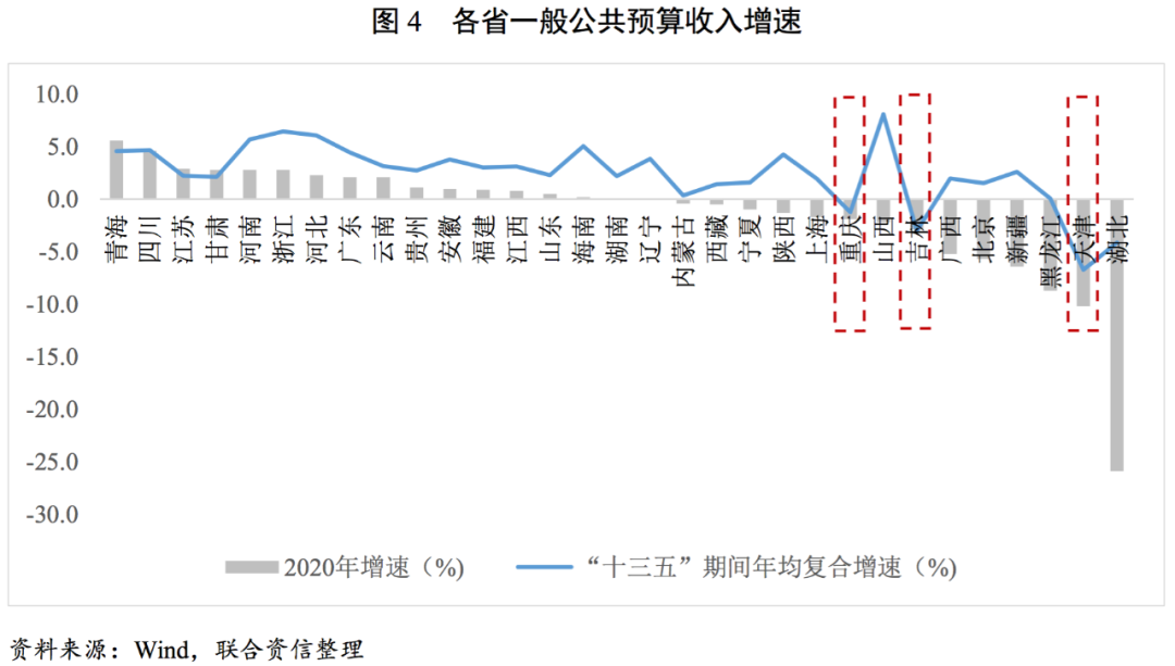 2020年,全國近半數(shù)省份一般公共預(yù)算收入下滑,其中天津、重慶、吉林在“十三五”期間年均復(fù)合增速為負,2020年的收入下滑不僅是由于疫情對供給和需求的沖擊,亦受到近年實施的減稅降費及核心產(chǎn)業(yè)增長乏力等因素的影響較大。2020年各省一般公共預(yù)算收入增速中位數(shù)為同比增長0.1%,增速下滑的省份有14個,其中湖北、北京、新疆、黑龍江等地疫情集中爆發(fā)面積較大,受到的負面影響相對較大;另外,受近年推行的減稅降費政策以及部分核心產(chǎn)業(yè)增長乏力等因素影響,重慶、吉林、天津等地“十三五”期間年均復(fù)合增速均為負增長。