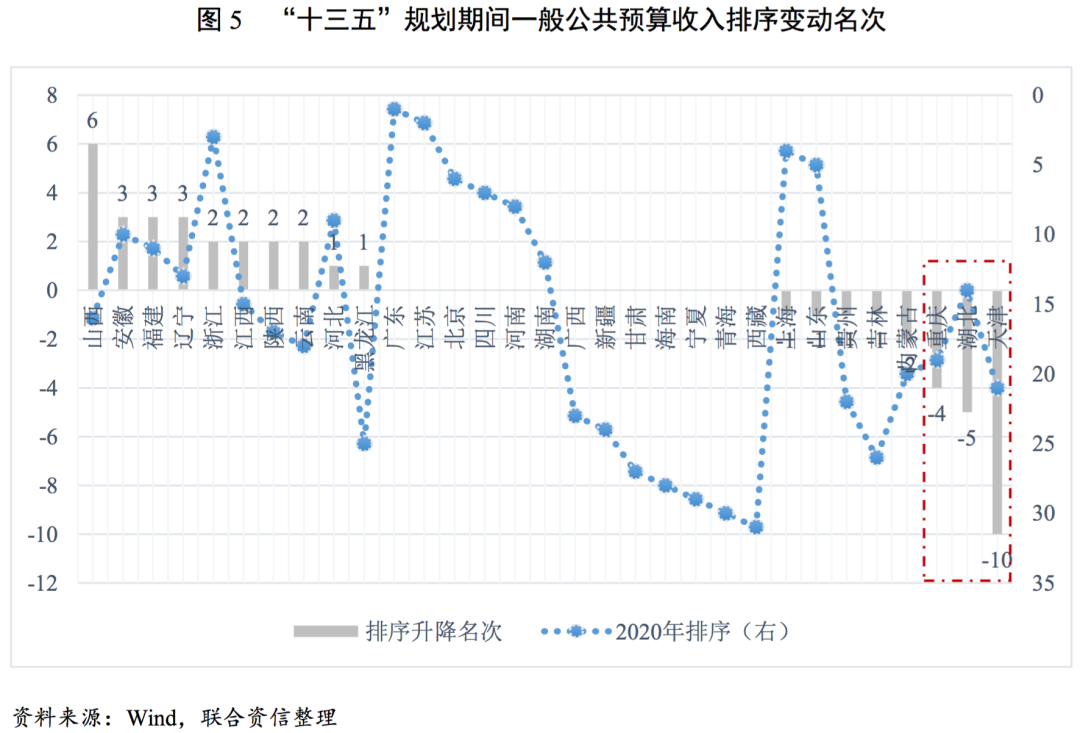 “十三五”期間,山西、安徽等地財政收入排序上升較多,天津、湖北、重慶排序下降較多,財政收入增長動力不足。2020年,是“十三五”規(guī)劃期間的收官之年,對比2016年,部分省份一般公共預(yù)算收入規(guī)模在全國的排序有所變動,代表著當?shù)亟?jīng)濟主體的綜合實力和居民的社會水平在變化。“十三五”期間,山西省一般公共預(yù)算收入名次上升幅度最大,2020年較2016年上升6名,主要受益于煤炭行業(yè)供給側(cè)改革紅利,安徽、福建和遼寧均上升3名,地區(qū)財政收入規(guī)模提升較快。名次下降方面,“十三五”期間,天津一般公共預(yù)算收入排序下滑10名,湖北和重慶分別下滑5名和4名,財政收入增長動力不足。
