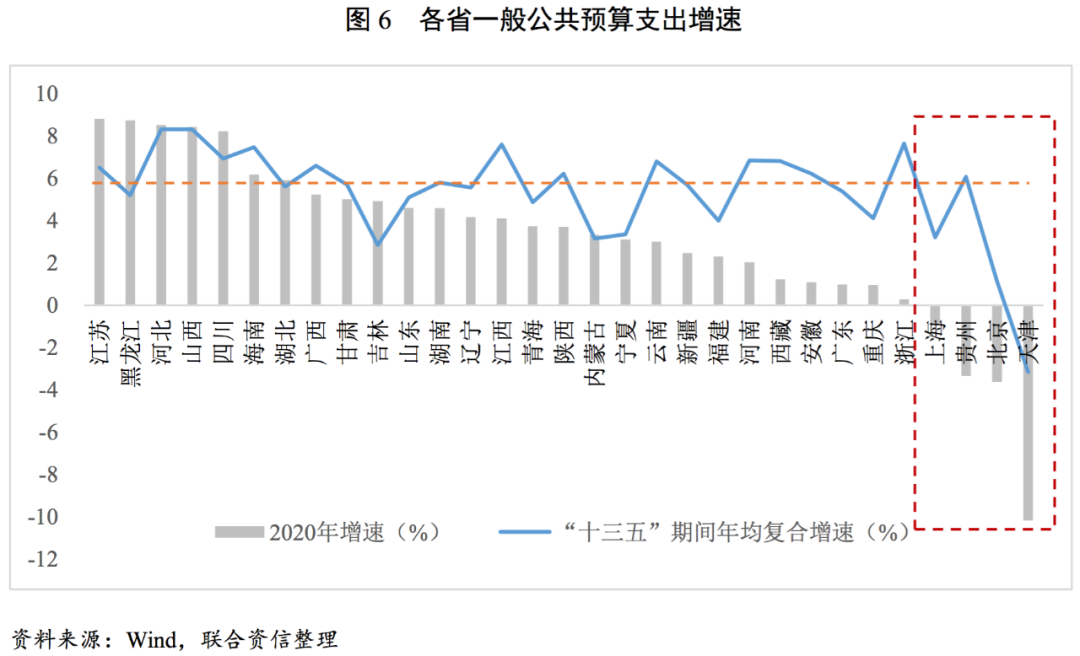 2020年大部分省份一般公共預(yù)算支出維持擴張態(tài)勢,但增速普遍低于“十三五”期間年均復(fù)合增速,支出增速呈下降態(tài)勢。2020年,一般公共預(yù)算支出增速中位數(shù)為3.71%,其中除了天津(-10.18%)、北京(-3.63%)、貴州(-3.35%)和上海(-0.94%)的一般公共預(yù)算支出同比下降外,其余省份均呈增長態(tài)勢。“十三五”規(guī)劃期間,各省一般公共預(yù)算支出年均復(fù)合增速中位數(shù)為5.69%,五年間呈現(xiàn)前高后低格局,主要系各地區(qū)貫徹執(zhí)行優(yōu)化財政支出結(jié)構(gòu),樹立過緊日子的思想,嚴格壓縮一般性支出,加大對重點領(lǐng)域支持力度,提高資金配置效率等精神指示[2],壓減不必要的財政支出,帶動2019年以來各省一般公共預(yù)算支出增速多成下降態(tài)勢,以積極應(yīng)對經(jīng)濟增速換擋、收支矛盾突顯等問題。