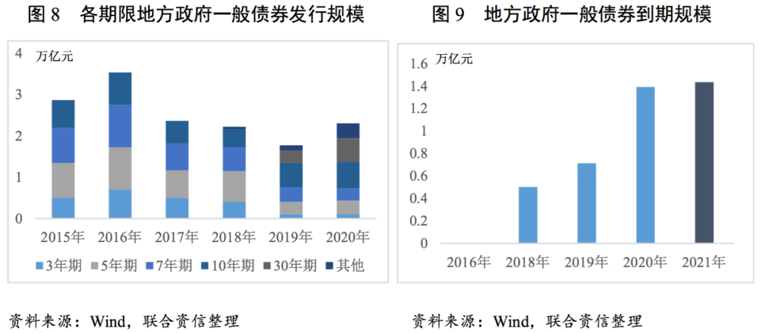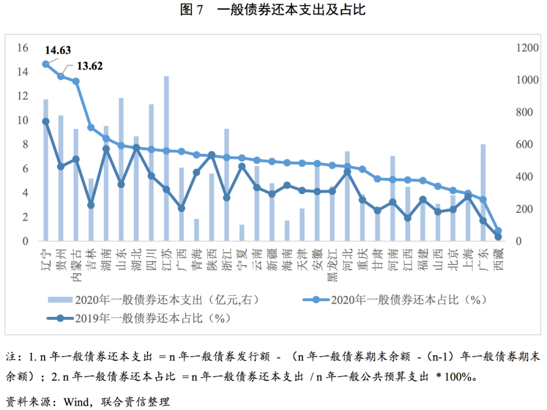 2020年,各省一般公共預(yù)算支出中用于償還一般債券本金的占比集中于5%~8%,較2019年進一步提高。2020年是全面實行地方政府債發(fā)行以來第一個集中兌付年份,隨著未來各地債券集中到期,各地債券還本支出占比將進一步提升,對其他公共財政支出項形成一定制約。由于2015年是我國地方政府債券實現(xiàn)全面發(fā)行的第一年,其中5年期債券發(fā)行占比較高,2020年進入政府債券集中兌付年份,各省一般債券還本支出占該省一般公共預(yù)算支出的比例持續(xù)提升。其中占比最高的省份分別為遼寧(14.63)、貴州(13.62%)和內(nèi)蒙古(13.21%),較2019年增幅也高于平均水平,三地也相繼發(fā)生城投信用風險事件,特別是非標產(chǎn)品的違約。其余省份的一般債券還本支出占比集中于5%~8%。隨著地方政府財政收支緊張程度的加深以及地方政府債務(wù)顯性化的推進,地方政府債券成為彌補財政收支差額的工具之一,地方政府債券限額連年提升,2021年地方政府債券還本支出較2020年進一步上升,一定時期內(nèi),在地方政府一般預(yù)算支出中的占比或?qū)⒊掷m(xù)提高。