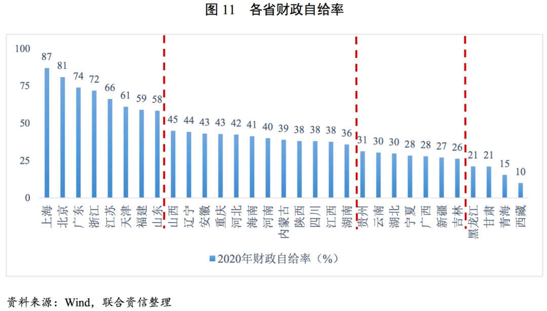 2020年,我國各省財政自給率中位數(shù)為38.26%,同比下降20.94個百分點,隨著階段性減稅降費措施的推進以及增值稅留底退稅規(guī)模超預(yù)期等原因,地方財政緊張局面進一步加劇。具體看,北上廣財政自給程度最高,江浙隨后,天津、福建及山東財政自給率亦在60%左右,整體自給能力較強,其中天津雖然財政收入下滑,但也相應(yīng)縮減財政支出,財政自給程度仍位列全國前列。多數(shù)省份財政自給率處于35%~45%,低于30%的省份中以西南、西北和東北為主,其中西北及東北省份財政收入規(guī)模小,財政自給率低更多是收入端的原因,而西南省份及廣西財政收入規(guī)模處于全國中等水平,但財政支出相對規(guī)模較大,財政自給率低更多是支出端的原因。
