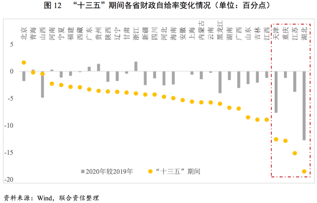 從財政自給率變動情況看,2020年,湖北、天津財政自給率下降最多,分別為13個百分點和8個百分點,大部分省份僅下滑1~2個百分點。從整個“十三五”規(guī)劃期間看,各省地方財政平衡能力均呈減弱趨勢,其中湖北、江蘇、重慶、天津財政自給率下滑幅度較大,超過10個百分點,地方財政緊張程度加深。