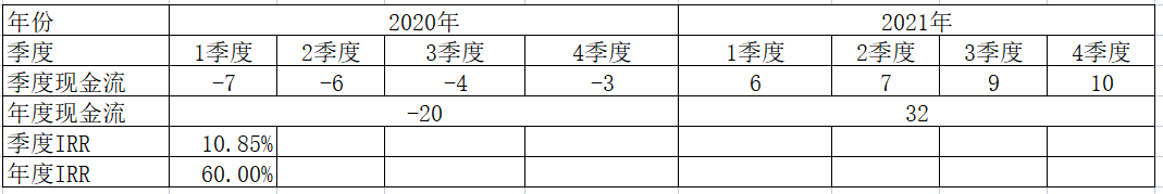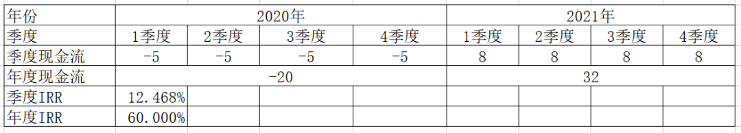 顯然,(1+季度IRR)^4=51%≠60%,這個時候就不能再使用上述公式。