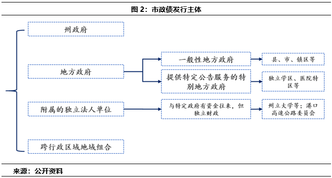 當下而言,美國市政債的發行主體主要為州、地方政府或者前兩者的附屬單位,此外還可以為跨行政區域的地域組合,具體如圖2。此外,需要注意的一點是美國是邦聯制國家,雖然這些地方政府大小不一,但從制度來看,他們發行市政債券具有獨立自主權,在不違反聯邦和州法律基礎上,不需要聯邦政府和上級州的批準和同意,獨立發行亦獨立負責償還責任。