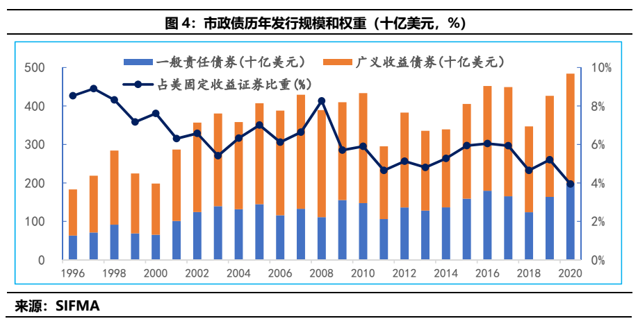 此外,市政債規模方面,從歷年發行規模來看,根據SIFMA披露的相關數據來看,其規模維持在5000億美元以下一個較為恒定的區間,同時從品種結構來看市政債,目前以廣義的項目收益債為主。