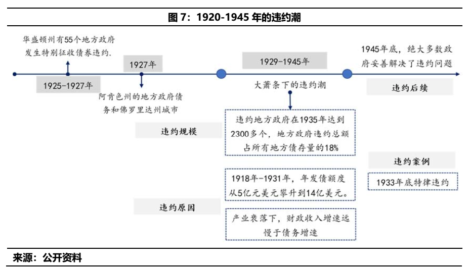 b)1929年的大蕭條之下,大范圍的違約潮開始爆發。從違約概況來看,根據相關文獻統計,違約地方政府在1935年達到2300多個,地方政府違約總額占所有地方債存量的18%。