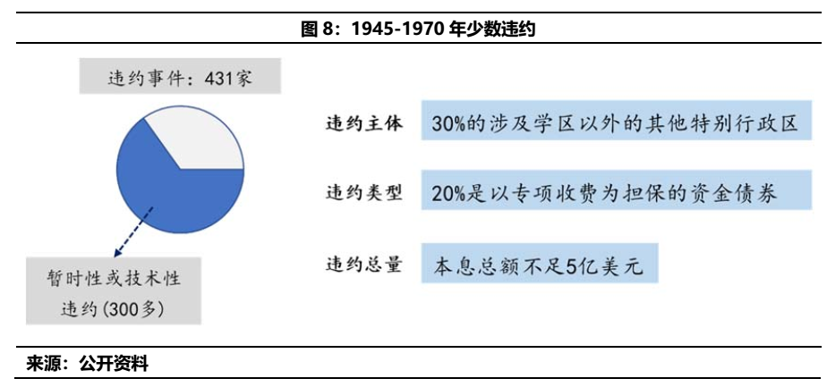 二戰結束后,美國經歷了將近30年的經濟繁榮,因此期間的地方政府違約較少。根據比較完整的統計,1945-1970年間,僅有431起違約,其中300多起涉及銀行查賬,屬于暫時性或技術性違約。同時這些案例中,涉及的投資者以地方政府所在區域的小銀行為主,影響范圍小。
