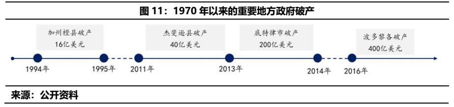 此外,考慮到國內城投債與市政債在某些維度上的相同點,關注風險爆發后的處置或許也能給我們一些可借鑒之處。以史為鑒,我們便來回溯美國歷史上的地方政府破產和違約的“至暗”瞬間: