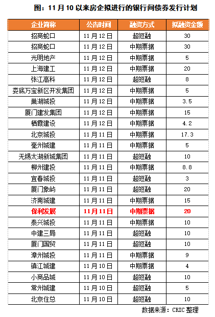 銀行間商協會座談會后,眾多房企密集發行中期票據和超短融資券。11月10日,常州城建、北京住總、小商品城宣布擬發行超短融資券,鎮江城建公告擬發行4億元的中期票據;到11月11日,保利發展宣布擬發行20億元的中期票據,將銀行間債券市場的融資主體從城投擴展到主流房企,而后11月12日,光明地產宣布擬發行5億元中期票據,招商蛇口公告擬分別發行30億元的中期票據和超短融,企業融資“冰凍”狀態有所緩解。