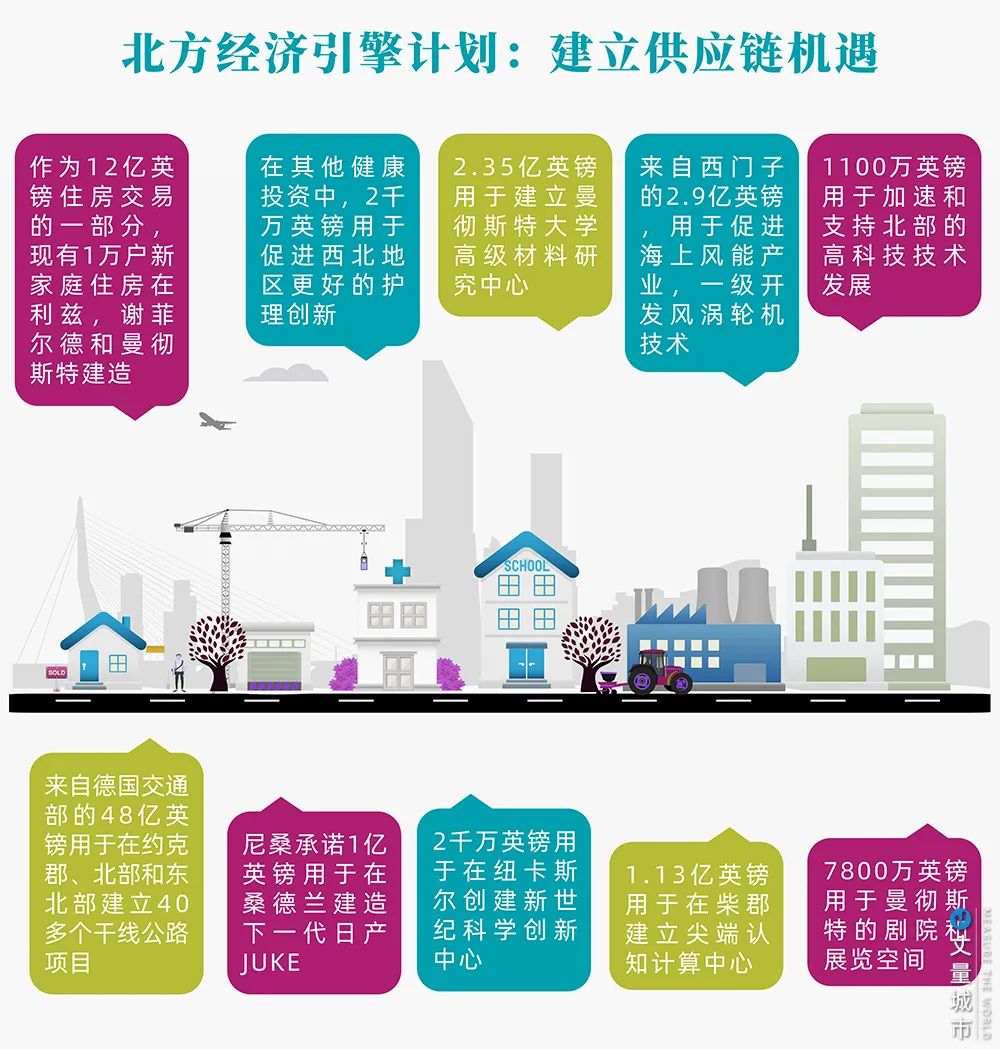 將在交通設施、商業、科技創新、教育、文化藝術等方面,通過下放權力、行政體制改革、大力發展基礎設施建設、升級科研、優化產業等措施,用政府財政撥款和企業投資相結合的方式,為北部城市地區建設發展提供資金支持,大力吸引海外投資,帶動英國整體發展。
