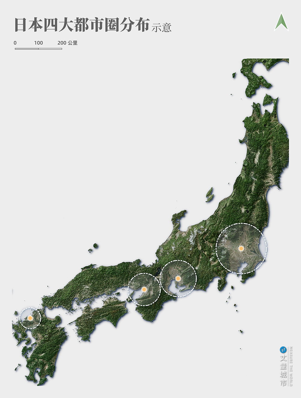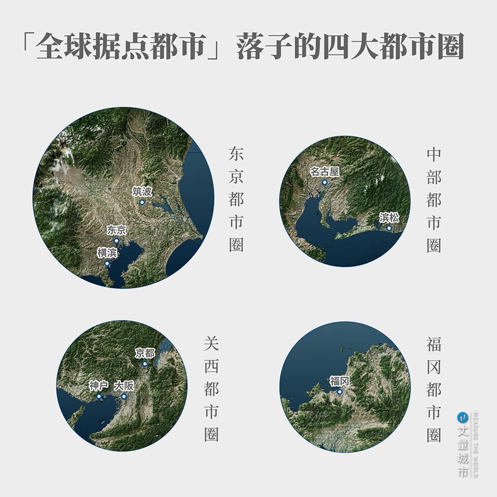 以東京為中心,包括橫濱市、筑波市等東京周邊重點城市在內的東京都市圈;愛知縣名古屋市和濱松市在內的中部都市圈;大阪市、京都市、神戶市在內的關西都市圈;九州地區的福岡都市圈。這也是全日本首位度最高的四大都市圈。