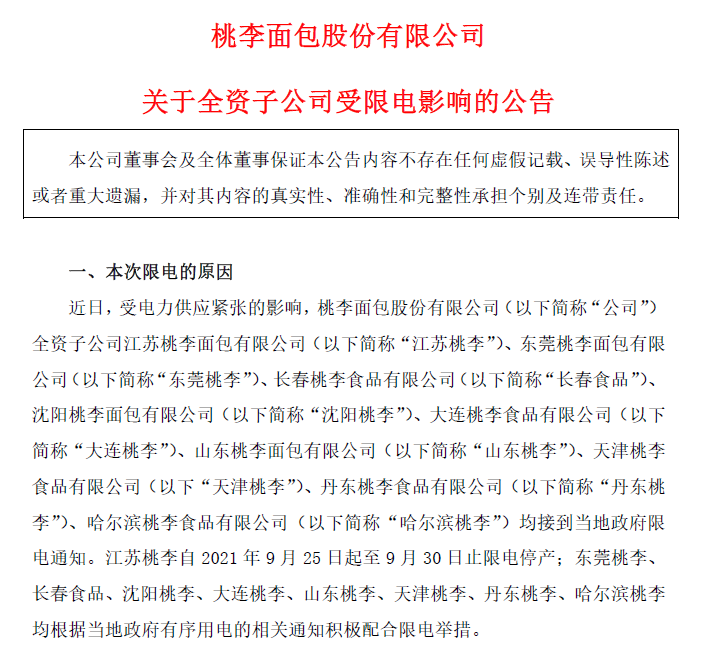 2021年9月底,桃李面包發布公告稱,近日受電力供應緊張的影響,公司旗下江蘇桃李、東莞桃李、長春食品等多家子公司均接到當地政府限電通知。