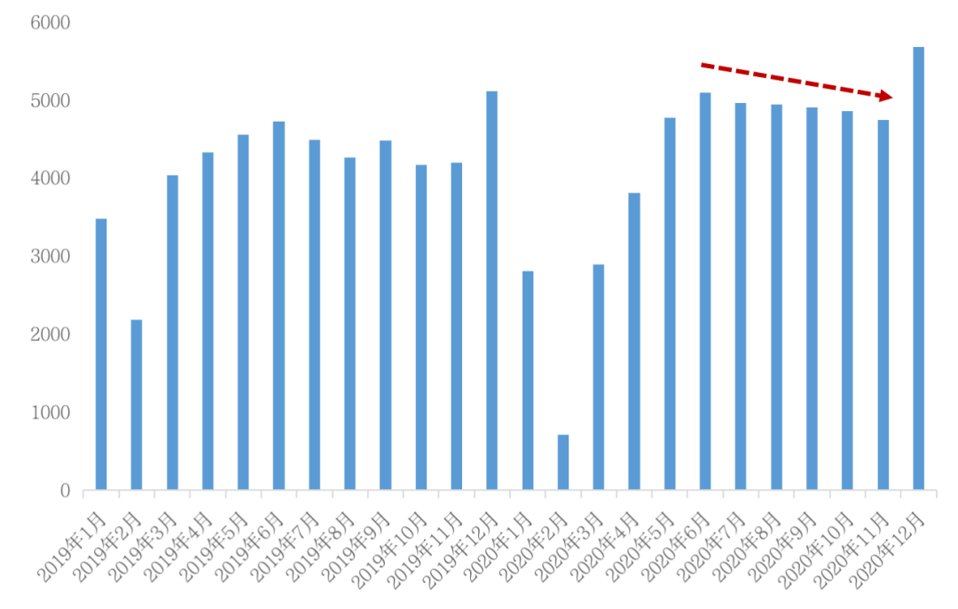 圖:2020年1-12月100個(gè)典型城市新建商品住宅月度供應(yīng)情況(單位:萬平方米)