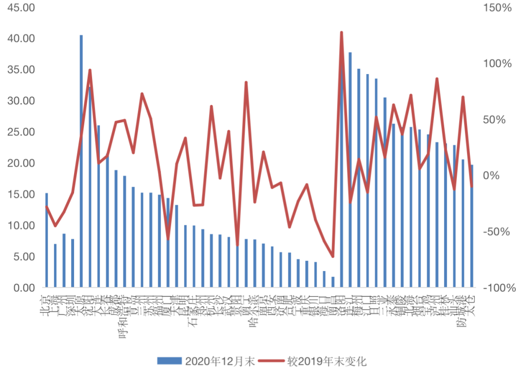 圖:2020年12月末50個(gè)城市新建商品住宅存量及較2019年末變化(單位:萬平方米)