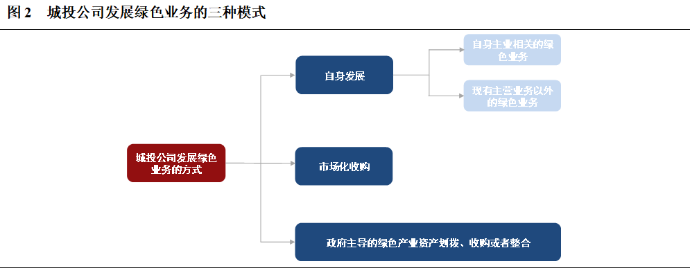 2017年以來,城投公司是非金融企業綠色債券的重要參與者,2020年,城投公司發行的綠色債券占全部非金融企業綠色債券的比例達到50%以上。城投公司發展綠色業務有三種方式:第一種方式是城投公司自身投資發展,可以沿著自身主業發展相關的綠色業務,還可以投資發展現有主營業務以外的綠色業務;第二種方式是城投公司自主以市場化方式收購綠色產業資產發展綠色業務。第三種方式是政府主導的城投公司綠色產業領域相關資產劃撥、收購或者整合。