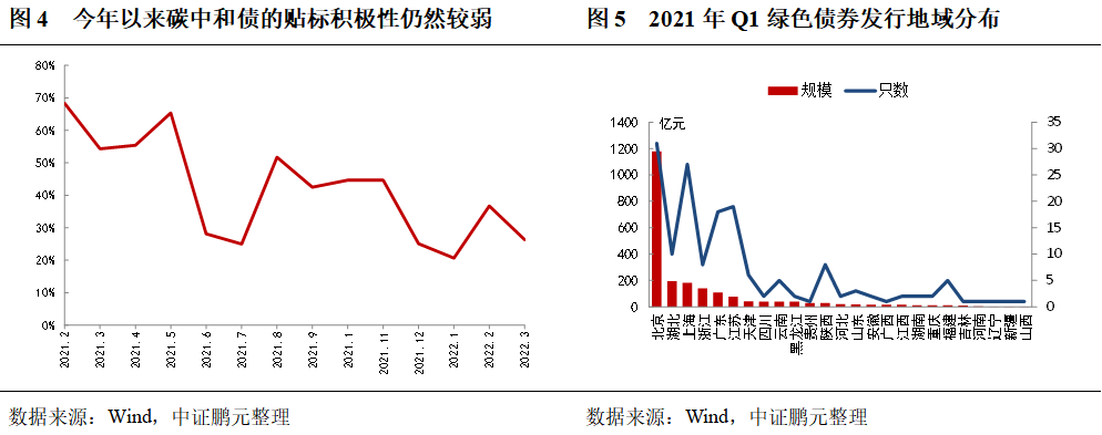 2022年Q1,有滿足條件的可比非貼標債券的非金融企業綠色債券共25只(以下簡稱“有效樣本”),其中綠色債券有發行成本優勢的有18只,占比72%。有效樣本中有8只城投債,其中7只均表現出了利率優勢;有效樣本中有6只貼標了“碳中和”,其中5只均表現出了利率優勢。18只有融資成本優勢的樣本中,貼標綠色債券節約的發行成本分布在1BP~77BP,成本優勢在40BP以上的有4只債券,其中3只均貼標了“碳中和”,2只為城投債,3只發行主體級別為AAA,1只發行主體級別為AA+