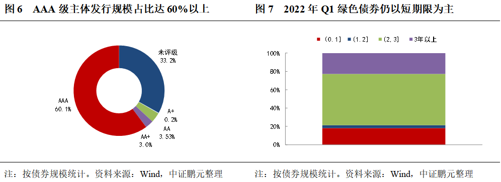 從發行人企業性質來看,國企依然是絕對主力,央企發行綠色債券規模最大。相應地,從發行主體信用等級看,2022年一季度AAA級發行規模占比達到60.13%。此外,受債券市場取消強制評級影響,未評級主體綠色信用債券的發現規模占比升至33.2%。從期限分布來看,2022年Q1綠色債券仍以3年期(含)以內短期限為主,發行規模占比77.11%。