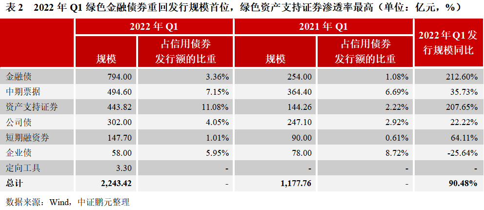 一季度綠色債券市場發行規模同比增長90.48%,凈融資規模已超過去年全年的一半。綠色金融債券重回發行規模首位,綠色資產支持證券滲透率最高,達11.08%。