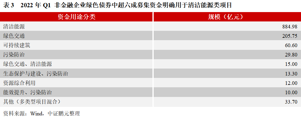 從資金用途來看,我們的分類標準參照《綠色債券支持項目目錄(2021年版)》中的二級項目分類,除綠色服務類項目外,綠色項目被分為能效提升、可持續建筑、污染防治、水資源節約和非常規水資源利用、資源綜合利用、綠色交通、綠色農業、清潔能源、生態保護與建設9大類。由于綠色金融債未明確具體的募投項目,因此我們考察非金融企業綠色債券的資金用途。2022年Q1清潔能源仍是第一大資金用途領域,發行規模為884.98億元,占非金融企業綠色債券發行規模的61.06%,接下來是綠色交通、可持續建筑、污染防治。其中,前三大資金用途領域均是碳中和債券領域。