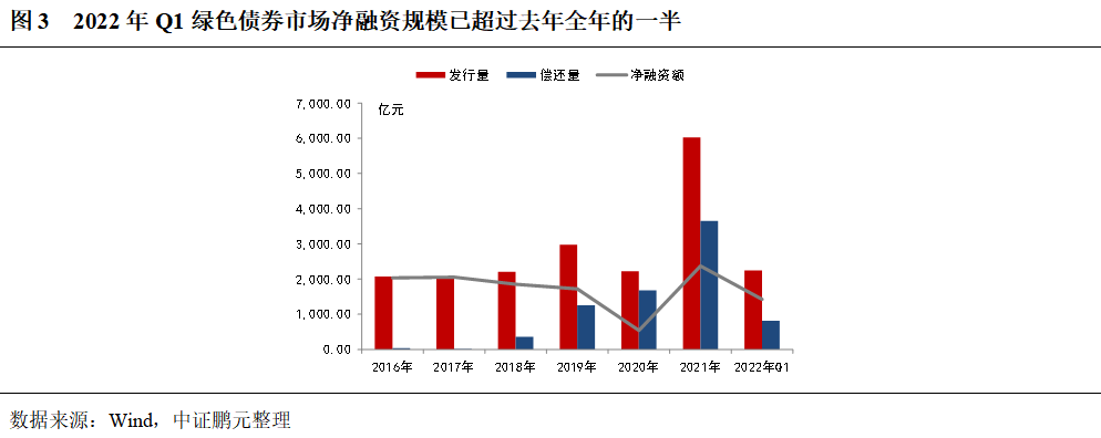 2022年Q1國內市場共發行綠色債券2,243.42億元(不包括綠色地方政府債),同比增長90.48%,與去年四季度相比,環比增長24.20%。Q1綠色債券市場凈融資1,424.67億元,已超過去年全年凈融資規模的一半。