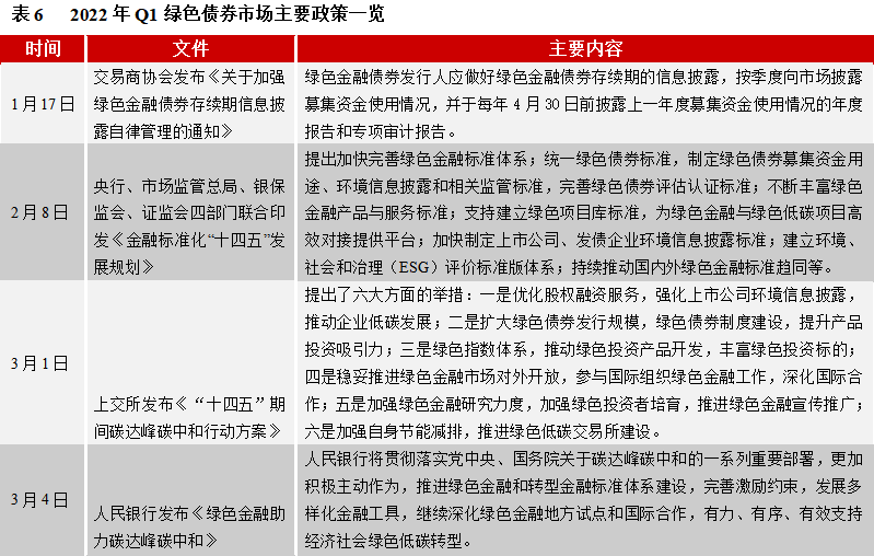 2022年3月5日的《政府工作報告》中提到“發展綠色金融,加快形成綠色低碳生產生活方式?!苯灰咨虆f會發文繼續強化綠色金融債券存續期信息披露管理。交易所在《“十四五”期間碳達峰碳中和行動方案》中提到:擴大綠色債券發行規模,推進公募REITs業務綠色發展,并將適時修訂發布綠色債券相關規則,還將強化對綠色債券和綠色資產支持證券市場監管,督促發行人按規定或約定用途使用募集資金,披露綠色項目進展情況和環境效益,敦促中介機構履職盡責,規范第三方認證機構對綠色債券評估的質量要求。