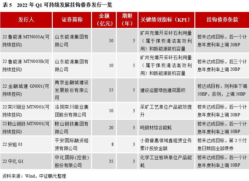 轉型金融產品方面,一季度共發行了7只可持續發展掛鉤債券,發行規模108億元。其中,平安國際融資租賃有限公司發行的“22安租01”選取的關鍵績效指標(KPI)為“小微普惠領域直租賃業務累計投放金額”,側重ESG中的“S(社會)”因素,這與目前市場已發行的其他可持續發展掛鉤債券選取“E(環境)”相關關鍵績效指標不同。根據發行資料,“22安租01”選取的關鍵績效指標符合聯合國17個可持續發展目標(SDG)中的8-“促進持久、包容和可持續經濟增長,促進充分的生產性就業和人人獲得體面工作”和9-“建造具備抵御災害能力的基礎設施,促進具有包容性的可持續工業化,推動創新源”。