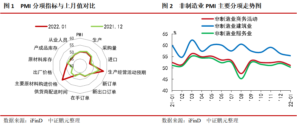 1月份,中國制造業(yè)采購經(jīng)理指數(shù)(PMI)為50.1%,前值為50.3%,回落0.2個百分點;非制造業(yè)商務(wù)活動指數(shù)為51.1%,較前值回落1.6個百分點;綜合PMI產(chǎn)出指數(shù)為51.0%,較前值下降1.2個百分點。