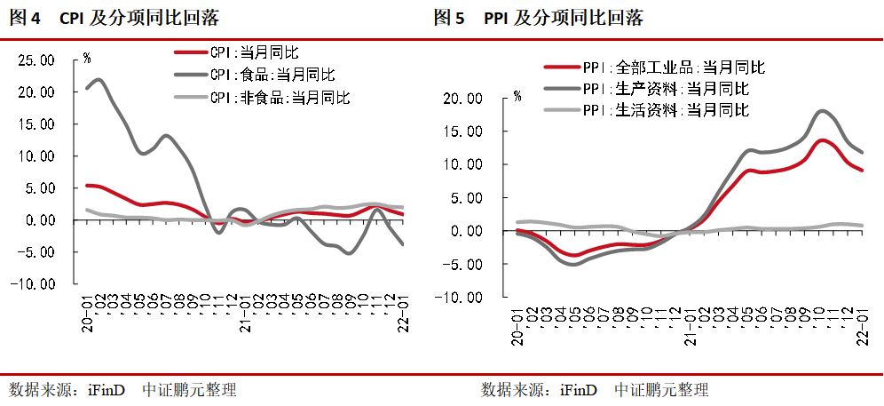 1月PPI同比上漲9.1%,漲幅比上月回落1.2個百分點。其中,生產(chǎn)資料價格上漲11.8%,漲幅回落1.6個百分點;生活資料價格上漲0.8%,漲幅回落1.6個百分點。從PPI環(huán)比來看,保供穩(wěn)價政策有力推進,煤炭、鋼材價格繼續(xù)回落,煤炭開采和洗選業(yè)價格下降3.5%,黑色金屬冶煉和壓延加工業(yè)價格下降1.9%。受國際原油價格回升影響,國內(nèi)石油相關(guān)行業(yè)價格回暖。石油和天然氣開采業(yè)價格由上月下降6.9%轉(zhuǎn)為上漲2.6%;化學(xué)原料和化學(xué)制品制造業(yè)、化學(xué)纖維制造業(yè)價格分別下降1.3%和0.1%,降幅比上月分別收窄0.8和3.0個百分點國際有色金屬價格上行,帶動國內(nèi)有色金屬冶煉和壓延加工業(yè)價格上漲0.8%。