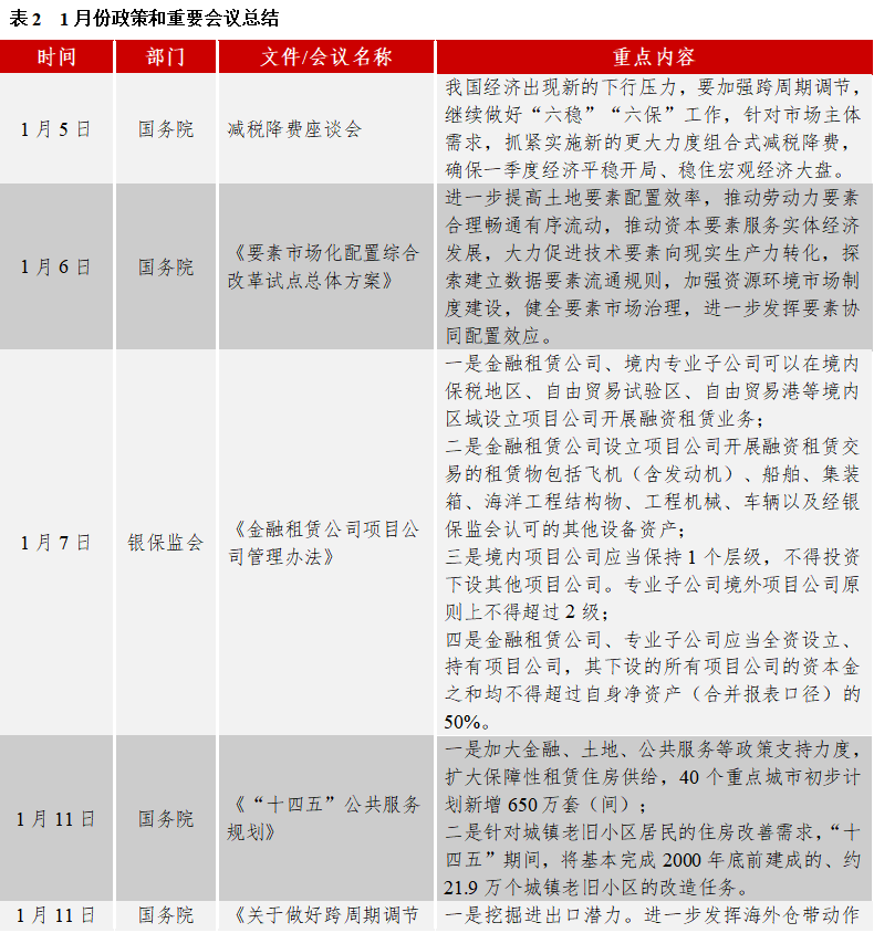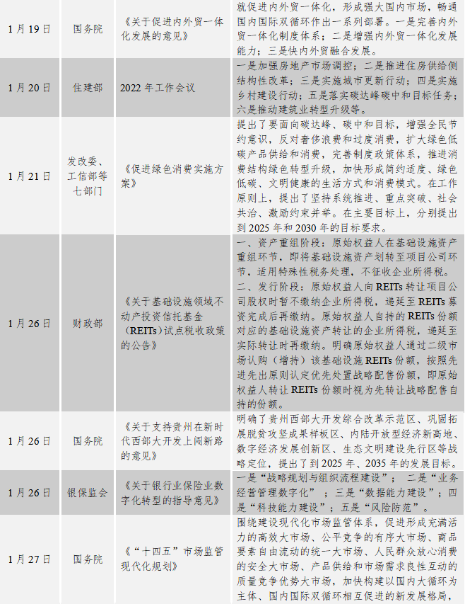 宏觀經(jīng)濟設(shè)計方面:1月6日,國務(wù)院印發(fā)了《要素市場化配置綜合改革試點總體方案》,要求加強資源環(huán)境市場制度建設(shè),健全要素市場治理,進一步發(fā)揮要素協(xié)同配置效應(yīng)。本月出臺了一系列穩(wěn)增長的政策和措施:國務(wù)院分別印發(fā)了《關(guān)于做好跨周期調(diào)節(jié)進一步穩(wěn)外貿(mào)的意見》、《關(guān)于促進內(nèi)外貿(mào)一體化發(fā)展的意見》,對我國外貿(mào)進一步發(fā)展提出要求;發(fā)改委聯(lián)合相關(guān)部門分別印發(fā)了《關(guān)于做好近期促進消費工作的通知》、《促進綠色消費實施方案》,對促進消費和綠色消費的措施進行了明確。1月,國務(wù)院分別印發(fā)了多份“十四五”發(fā)展規(guī)劃:《“十四五”數(shù)字經(jīng)濟發(fā)展規(guī)劃》、《“十四五”公共服務(wù)規(guī)劃》、《“十四五”市場監(jiān)管現(xiàn)代化規(guī)劃》、《關(guān)于支持貴州在新時代西部大開發(fā)上闖新路的意見》。