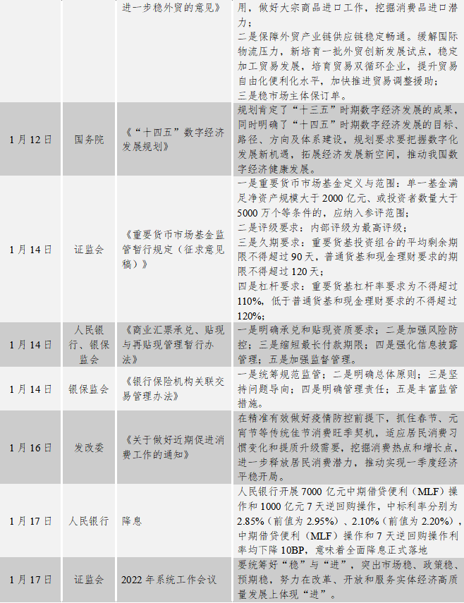 債券市場制度建設(shè)方面:1月7日,銀保監(jiān)會下發(fā)《金融租賃公司項目公司管理辦法》,對金融租賃公司、境內(nèi)專業(yè)子公司開展融資租賃業(yè)務(wù)進行了業(yè)務(wù)、范圍、結(jié)構(gòu)等方面要求和規(guī)范。1月14日,證監(jiān)會發(fā)布《重要貨幣市場基金監(jiān)管暫行規(guī)定(征求意見稿)》,定義與范圍,杠桿、久期等方面對重要貨幣基金進行了要求。1月14日,人民銀行、銀保監(jiān)會發(fā)布《商業(yè)匯票承兌、貼現(xiàn)與再貼現(xiàn)管理暫行辦法》,一是明確承兌和貼現(xiàn)資質(zhì)要求;二是加強風(fēng)險防控;三是縮短最長付款期限;四是強化信息披露管理;五是加強監(jiān)督管理。1月17日,人民銀行開展7000億元中期借貸便利(MLF)操作和1000億元7天逆回購操作,操作利率均下降10BP,意味著全面降息正式落地。1月20日,住建部召開年度系統(tǒng)工作會議,要求一是加強房地產(chǎn)市場調(diào)控;二是推進住房供給側(cè)結(jié)構(gòu)性改革;三是實施城市更新行動;四是實施鄉(xiāng)村建設(shè)行動;五是落實碳達峰碳中和目標任務(wù);六是推動建筑業(yè)轉(zhuǎn)型升級等。1月26日,財政部發(fā)布《關(guān)于基礎(chǔ)設(shè)施領(lǐng)域不動產(chǎn)投資信托基金(REITs)試點稅收政策的公告》,對我國基礎(chǔ)設(shè)施REITs試點明確了相應(yīng)部分稅收政策,在資產(chǎn)重組和發(fā)行階段,減免和轉(zhuǎn)讓時遞延所得稅,這標志著中國REITs稅收制度建設(shè)正式開啟,意義重大,公募REITs進入快速發(fā)展階段。