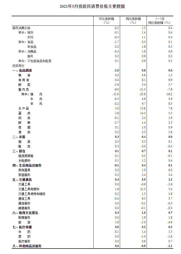 數(shù)據(jù)顯示,2021年5月份,全國居民消費價格同比上漲1.3%。具體來說:食品價格上漲0.3%,非食品價格上漲1.6%;消費品價格上漲1.6%,服務(wù)價格上漲0.9%。
