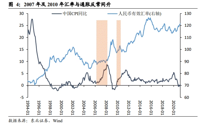 同時注意人民幣的走勢。一般來說,物價走高和匯率是反的。但是2007年、2010-2011年兩段輸入性物價壓力比較大的時期,人民幣卻反常升值。