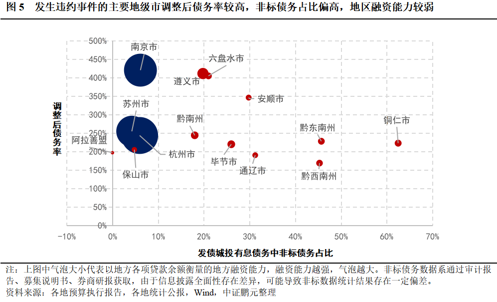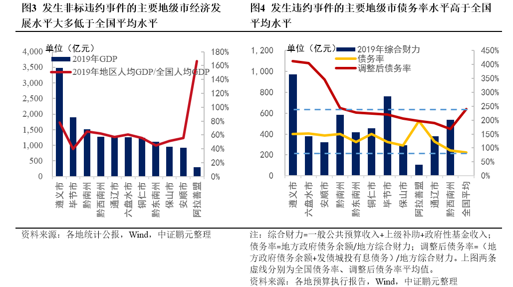 從地區(qū)經(jīng)濟(jì)發(fā)展水平來看,發(fā)生非標(biāo)違約事件的主要地級市經(jīng)濟(jì)發(fā)展水平低于全國平均,其中阿拉善盟人均GDP水平較高,主要系該地常住人口規(guī)模較小,僅25.1萬人,實(shí)際經(jīng)濟(jì)實(shí)力仍較弱。從地區(qū)債務(wù)率來看,發(fā)生非標(biāo)違約事件的主要地級市債務(wù)率高于全國平均債務(wù)率,遵義市、六盤水市、安順市以及黔南州調(diào)整后債務(wù)率高于全國平均數(shù)。