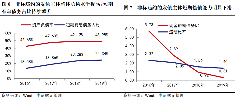 (2)從區(qū)域特征來看,非標(biāo)違約地區(qū)經(jīng)濟(jì)實(shí)力較弱,債務(wù)率較高,非標(biāo)占比偏高,且地區(qū)融資能力較弱;從主體財(cái)務(wù)特征來看,非標(biāo)違約的發(fā)債城投主體短期償債能力快速下滑,短期償債壓力明顯增加。需特別關(guān)注具有上述風(fēng)險(xiǎn)特征的城投主體。