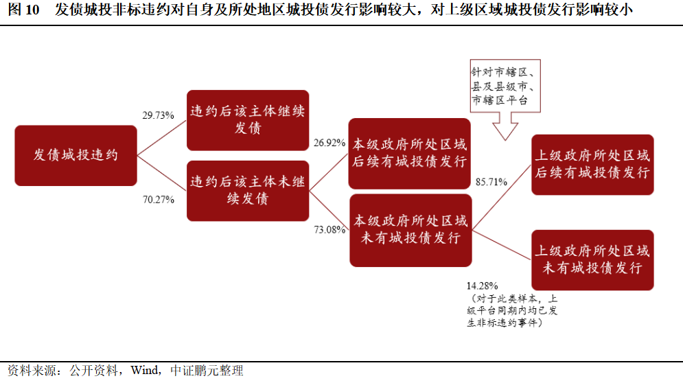 通過對2018年以來非標(biāo)違約事件梳理,可以得到以下結(jié)論:(1)發(fā)債城投非標(biāo)違約后,占比70.27%的發(fā)債城投后續(xù)未有城投債發(fā)行;(2)發(fā)債城投非標(biāo)違約后,占比51.35%的平臺所處區(qū)域未有城投債發(fā)行;(3)城投非標(biāo)違約對上級政府所處區(qū)域城投債發(fā)行影響較小。