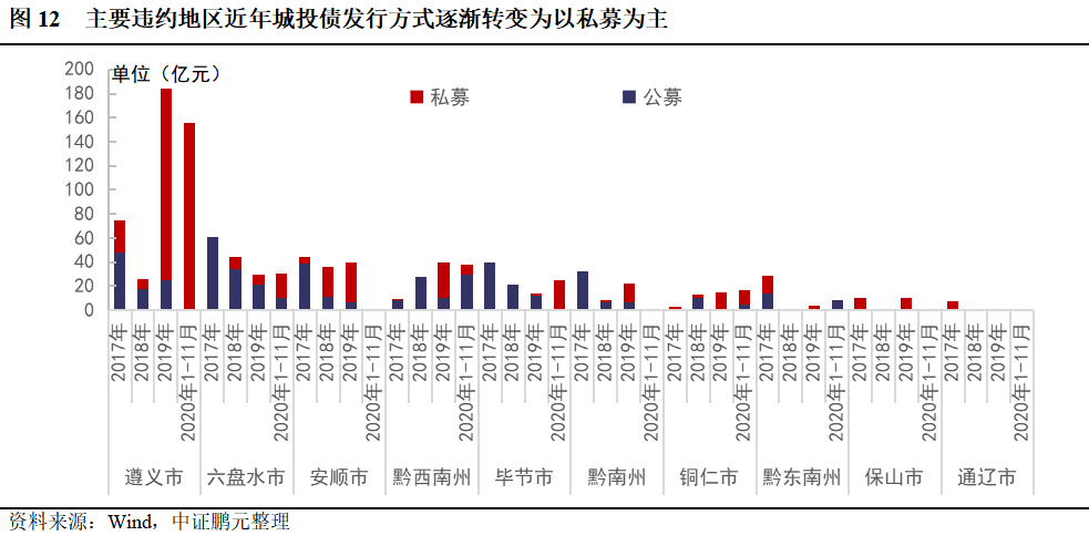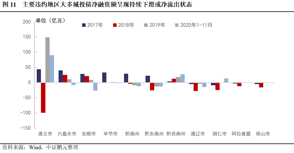 從違約平臺所處地級市城投債發(fā)行情況來看,除遵義市、黔西南州外,其余地區(qū)城投債凈融資額呈現(xiàn)持續(xù)下滑或凈流出狀態(tài),非標(biāo)違約對區(qū)域城投發(fā)行影響較大。2019年遵義市凈融資額有所回升,可能源于以下因素:首先,2019年初遵義市長拜會國開行貴州省分行,雙方達(dá)成一致意見:遵義作為革命老區(qū),是黨中央、國務(wù)院重點(diǎn)關(guān)心關(guān)注區(qū)域,國開行貴州省分行將按照總行要求,不斷創(chuàng)新融資模式,圍繞既有利于發(fā)展,又有利于化債目標(biāo),在推動遵義經(jīng)濟(jì)社會發(fā)展中實(shí)現(xiàn)多贏,該舉措一定程度上提升了市場投資者信心;其次,近年遵義市GDP、財(cái)政收入在貴州省內(nèi)均排名第二位,地區(qū)經(jīng)濟(jì)實(shí)力相對較強(qiáng),相較其他違約區(qū)域,省政府及地方政府可能給予遵義市內(nèi)城投平臺的支持力度更大。近年黔西南州凈融資額呈上升趨勢,可能源于在發(fā)生違約事件的主要地級市中,黔西南州債務(wù)率水平相對較低,且已知的該地城投非標(biāo)違約事件最早發(fā)生于2020年3月,僅發(fā)生一起;但黔西南州整體凈融資規(guī)模仍較低。