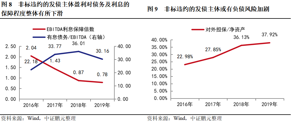 從償債指標(biāo)來看,近年非標(biāo)違約的發(fā)債主體資產(chǎn)負(fù)債率有所提升,2019年末平均值提升至48.98%,但較2016年末增幅不大。短期償債能力方面,非標(biāo)違約的發(fā)債主體短期有息債務(wù)占比提升較快,自2016年末的13.58%增至2019年末的24.34%,同時(shí)現(xiàn)金短期債務(wù)比自2016年的5.73下降至2019年的0.31,短期償債壓力明顯加大。2016年以來,非標(biāo)違約的發(fā)債主體有息債務(wù)與EBITDA之比總體有所上升,EBITDA利息保障倍數(shù)持續(xù)下滑,盈利對債務(wù)及利息的保障程度整體有所下降。此外,近年非標(biāo)違約的發(fā)債主體對外擔(dān)保占凈資產(chǎn)的比例持續(xù)增加,考慮到城投平臺對外擔(dān)保實(shí)際多為對區(qū)域內(nèi)平臺擔(dān)保,地區(qū)互保風(fēng)險(xiǎn)有所加大,這也導(dǎo)致一家城投平臺非標(biāo)違約后,債務(wù)風(fēng)險(xiǎn)極有可能向區(qū)域內(nèi)其他平臺蔓延。